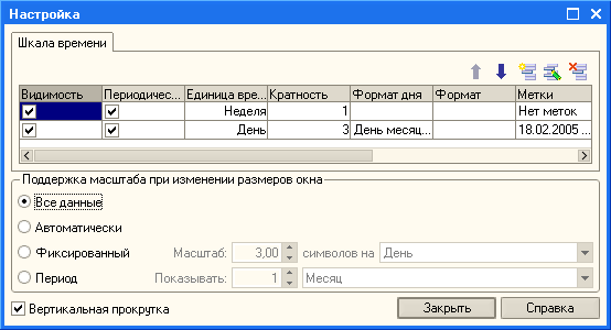 В любой момент времени можно динамически добавлять и удалять уровни шкалы времени и управлять их представлением. Для каждого уровня можно указывать градацию шкалы, формат текстового представления меток и вид линий сетки. На шкале времени можно использовать непериодические метки для обозначения, например, некоторых контрольных точек: