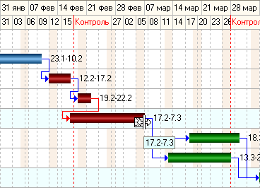 Редактирование длительности и расположение задач с последующим пересчетом дат в связанных задачах;